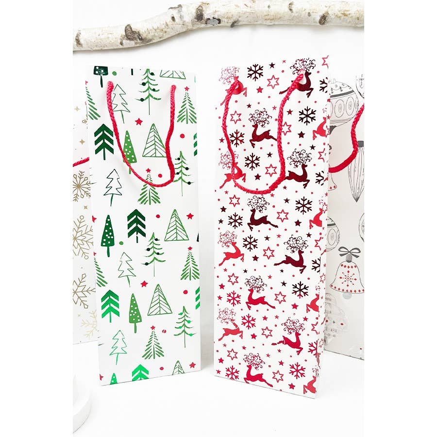 Christmas Theme Wine Gift Bag -The design is simple yet sophisticated, adorned with beautiful printed patterns and decorations to make your wine gifts stand out and unique. -Dimension- 14 1/4Inch L x 5 Inch W x 3 1/4 Inch D -4 Styles Wine Gift Bag Assorted