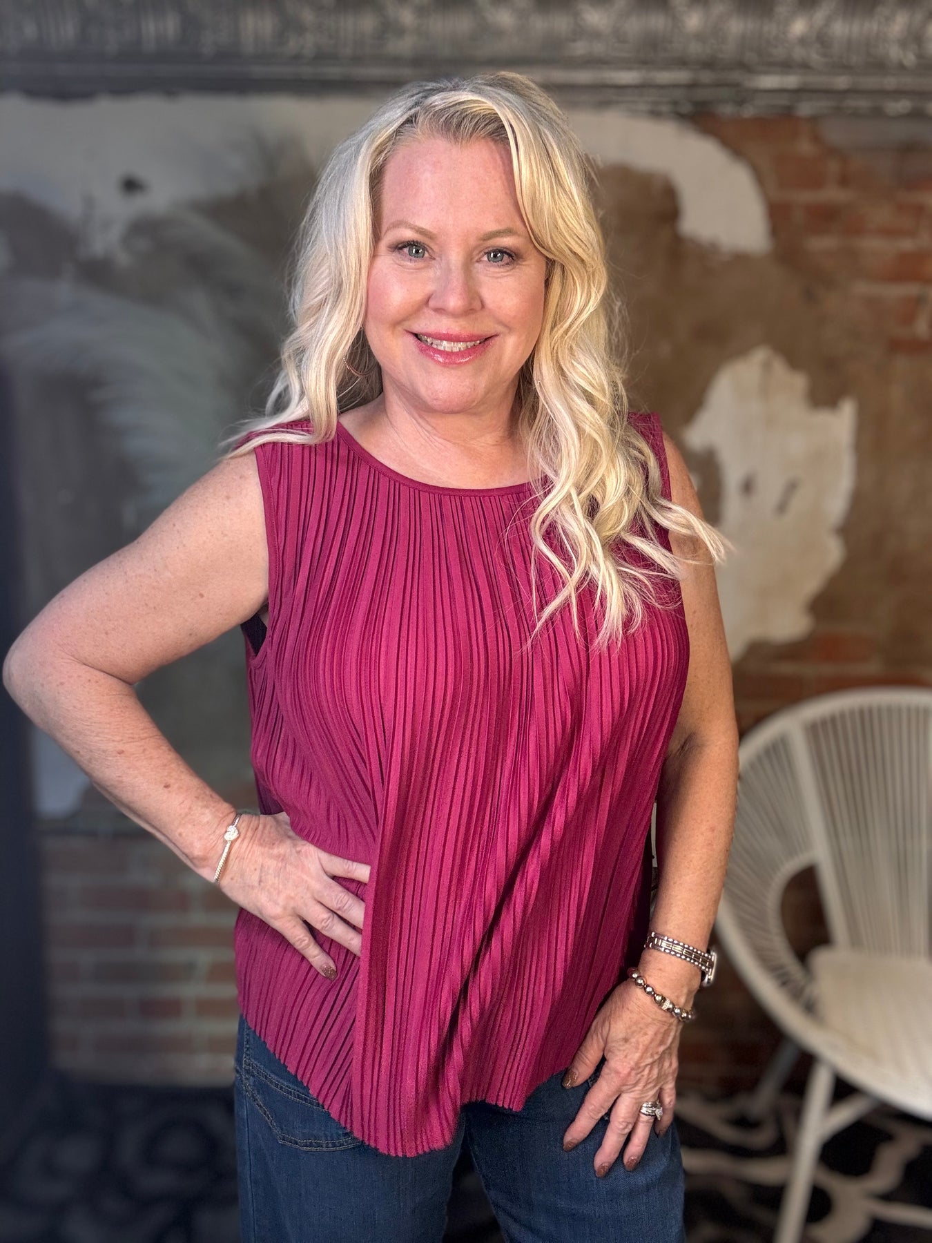 Refined yet relaxed, the Women's Liverpool Sleeveless Boat Neck Blouse is the kind of wardrobe staple that works year-round. Designed with a graceful boat neckline, sleeveless cut, and delicate vertical pleats, this chic, soft piece flatters every silhouette with its easy, relaxed fit and rounded hem. The rich Dark Currant color adds a bold pop that transitions beautifully from spring to summer, and layers effortlessly under jackets for fall fashion. Perfect for workdays, weekends, and everything in between, this top brings elevated ease to any outfit.