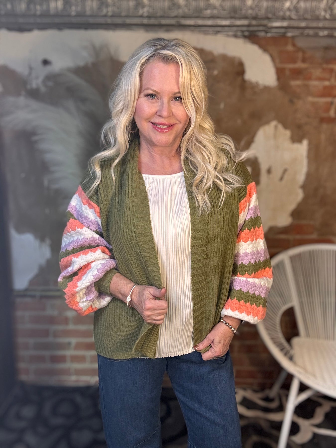 Layer on effortless style with the Pippa Cardigan, designed in a green and multi-color stripe pattern that adds a playful pop to any outfit. The open-front design makes it easy to throw on over tanks, tees, or blouses, while the ribbed knit texture and long sleeves bring cozy comfort. A versatile piece for both casual days and polished layering, this cardigan is one you’ll reach for season after season.