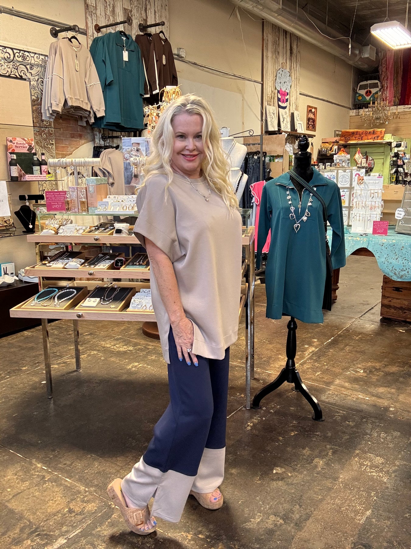 P. CILL Butter Modal Contrast Rib Short Sleeve Tunic Top - Taupe
